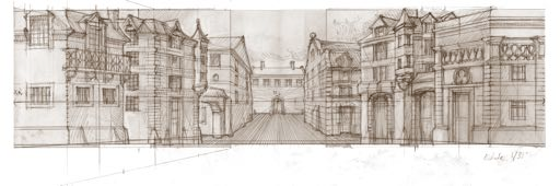 Le décor a été conçu d’après le tableau des Farceurs français et italiens depuis 60 ans et plus sur le Théâtre Royal en 1670, en corrélation avec les traités de scénographie et de perspective de Sabbattini et Du Breuil. C’est lui qui a été choisi comme modèle idéal de « carrefour comique », puisqu’on y voit Molière dans son costume d’Arnolphe. Ce type de décor d’une place de ville se prêtait à un très large répertoire. Les décors sont en ce moment en cours de réalisation, de façon artisanale comme à l’époque : toile de lin peint à la détrempe (colle de peau de lapin) cloué au fer sur des châssis de pin en L, chantournés de découpes en tilleul. Seules concessions à l’époque actuelle : les toiles seront ignifugées et un faux plancher donnera l’illusion d’une scène de planches.